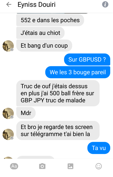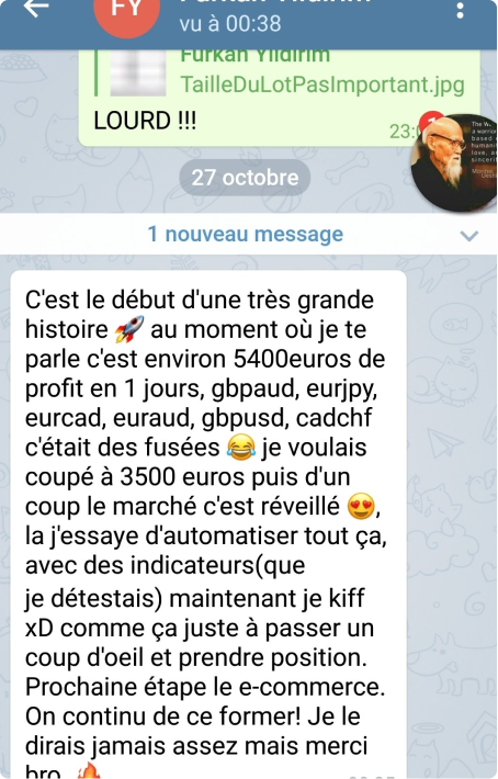 "Aujourd'hui j'ai décidé de me faire plaisir avec mes gains réalisés en trading. Merci à Mat et au #ForexGang car c'est grâce à ca que je vis maintenant tous les jours."