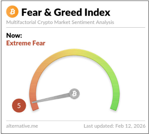 Le moral des investisseurs est à 5 (peur extrême) selon l’indice “Crypto Fear & Greed Index”